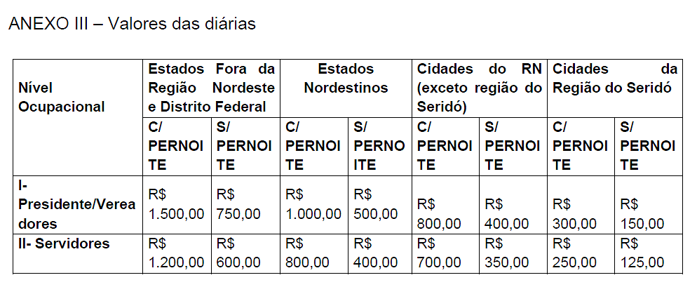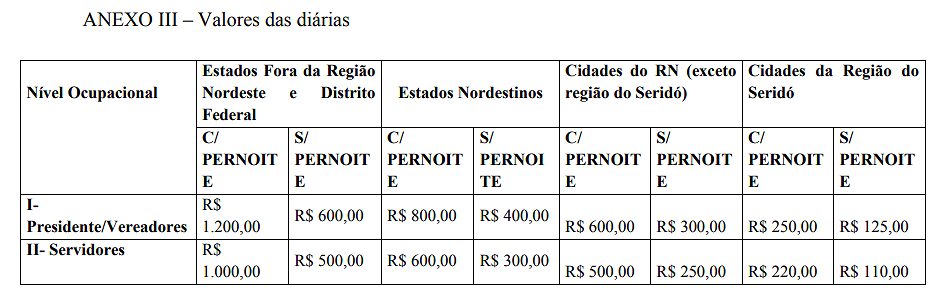 Fica alterado o Anexo III da Resolução nº 001/2022, com os valores das diárias da Câmara Municipal de Acari/RN, conforme abaixo: